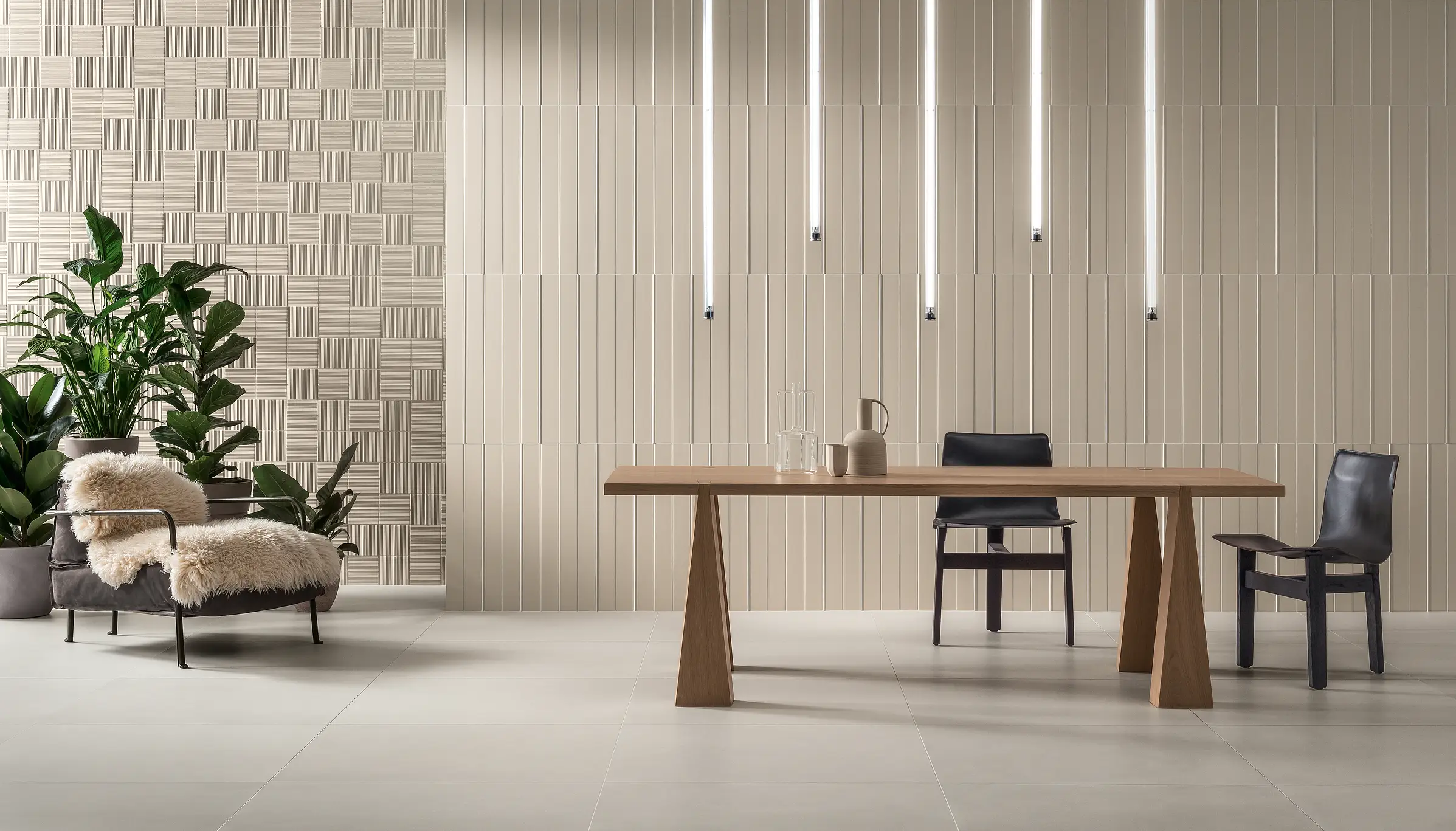These tiles are incredibly versatile—ideal for minimalist interiors and combining with other textures like wood to create a cozy atmosphere. Our collections also include embossed wall coverings that challenge creative boundaries.